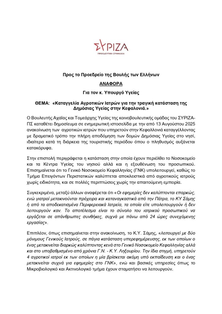 Ο Βουλευτής Αχαΐας και Τομεάρχης Υγείας της Κοινοβουλευτικής Ομάδας του ΣΥΡΙΖΑ-Προοδευτική Συμμαχία Ανδρέας Παναγιωτόπουλος, σε συνέχεια της κοινοβουλευτικής ερώτησης για την υποστελέχωση του Κέντρου Υγείας Ιθάκης, κατέθεσε στη Βουλή Αναφορά προς τον Υπουργό Υγείας, με αφορμή την ανακοίνωση των αγροτικών ιατρών της Κεφαλονιάς, που δημοσιεύθηκε στις 13 Αυγούστου 2025 και αποτυπώνει με δραματικό τρόπο την πλήρη αποδόμηση των δομών Δημόσιας Υγείας στο νησί.